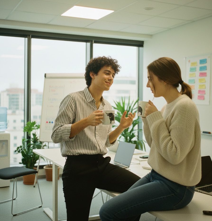 写真には、オフィスにいる2人の若い人が写っています。仕事仲間のようで、コーヒーを飲んでいます。
